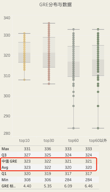 TOP60以上的录取者的平均GRE在320左右,若你的目标是TOP30甚至更前的院校,一个320以上的成绩就够用了。