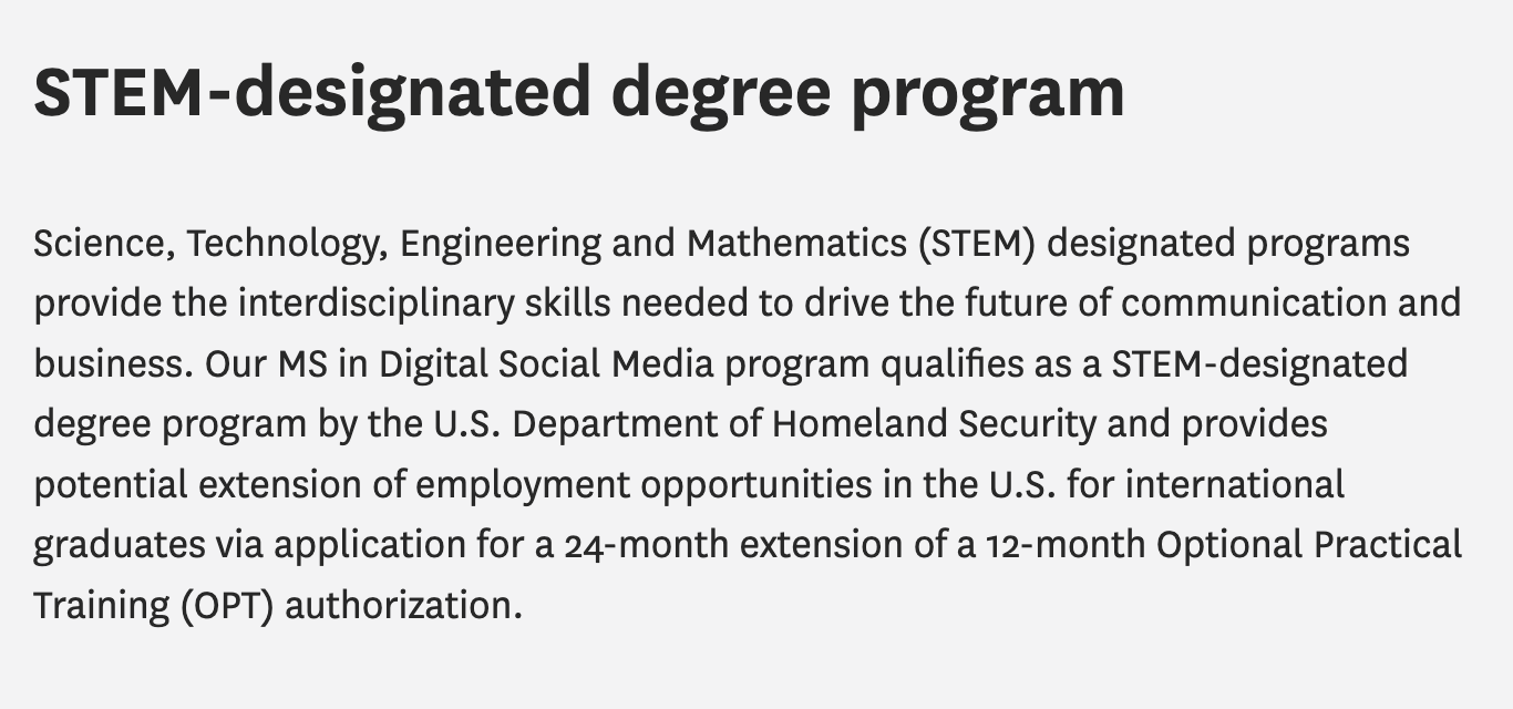 大部分的传播学项目都不属于STEM专业,但是随着数字媒体的发展和由数据驱动的内容的增加,部分与数据科学、数据分析交叉的课程内容也设有STEM导向。e.g 南加州大学的传播数据科学(MS in Communication Data Science),数字社交媒体(MS in Digital Social Media)。