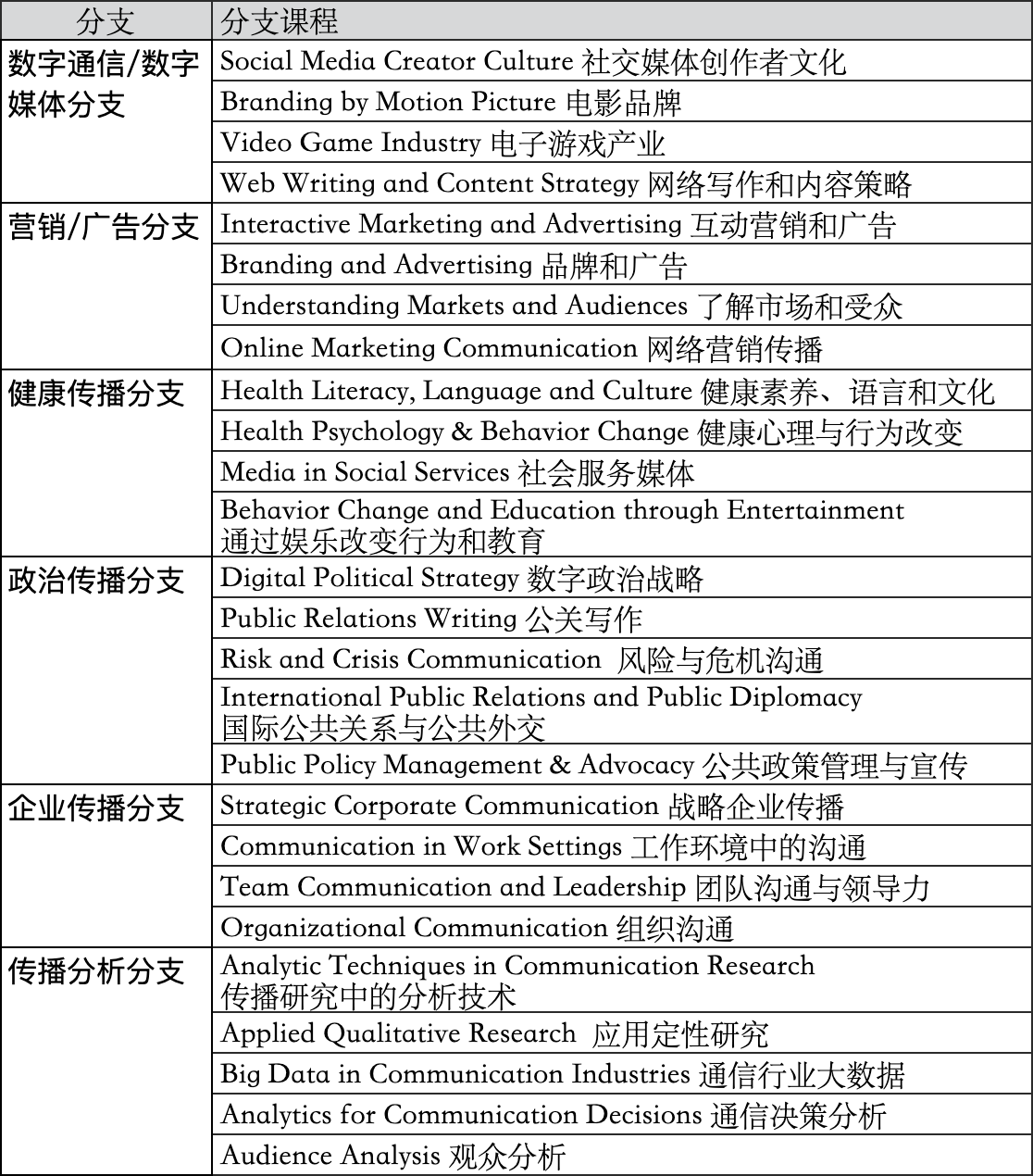 以约翰霍普金斯为例,它有5个分支方向可供学生选择,以下是各个分支的介绍以及各分支的核心课程供,仅供参考:营销传播:营销传播领域集中于与顾客、客户和组织外的普通消费者的商业沟通管理。对于在营销和销售、宣传和促销、市场研究、营销管理、社会营销、广告等方面有职业兴趣的个人来说,它特别有价值。媒体:媒体是为希望在数字媒体技术、游戏和娱乐领域追求或扩展职业生涯的学生准备的。学生将学习媒体技术和政治、社会、娱乐和全球化所带来的日益复杂的可能性。健康和社会传播:健康和社会变化沟通领域的重点是如何通过有效的信息传播来影响积极的行为和社会变化,多应用于卫生、非营利和公共部门。政治传播:这一领域集中解决从竞选战略到运营新闻办公室到影响公共政策的问题。无论人们是在执政、竞选公职,还是推动政策变化,传播都是政治的核心。公司传播:企业传播领域考察了组织内部的沟通功能以及沟通过程。对于在人力资源管理、企业沟通、战略规划、运营管理、沟通咨询和其他一般管理职能方面有职业和/或职业兴趣的个人尤其有价值。传播分析:传播分析领域是为寻求通过对数据的理解为营销、媒体和其他类型的组织提供更大价值的传播专业人士而设。重点分析领域将数据分析思维与通信管理专业知识相结合,从应用研究的角度解决问题。