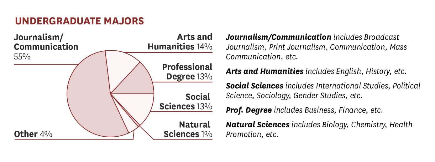 根据我们的经验,申请传媒类专业研究生的学生本科多为社科和文科专业背景(经济学、传播学、新闻学、商务英语和汉语言文学),极少数学生本科是理工类专业(如统计学)申请。