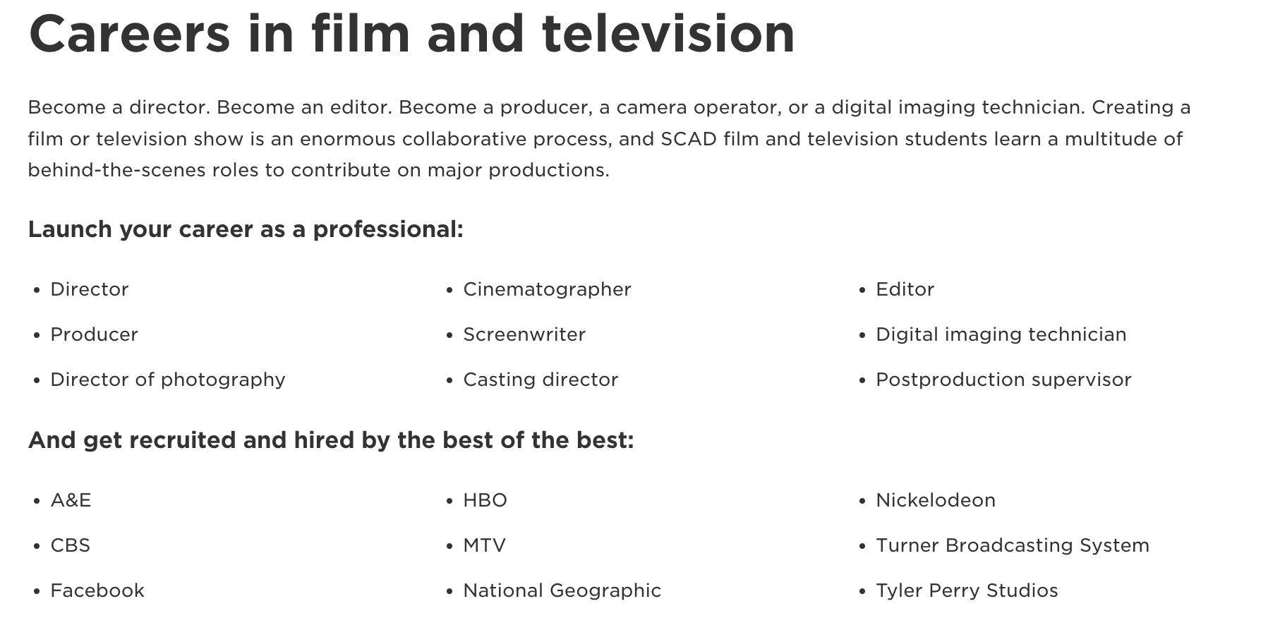 根据萨凡纳艺术与设计学院的就业报告,电影专业的毕业生通常会去到媒体公司和电影制片厂,例如A&E、CBS、Facebook、HBO、MTV、National Geographic、Nickelodeon、Turner Broadcasting System和Tyler Perry Studios。