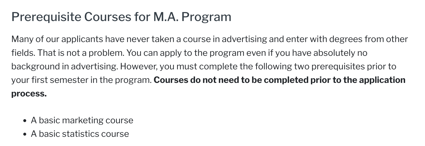 PS:申请广告学专业学生不需要拥有广告的本科学位,但若你对广告学感兴趣可以在本科选修一些广告、市场营销或统计学有关的先修课。