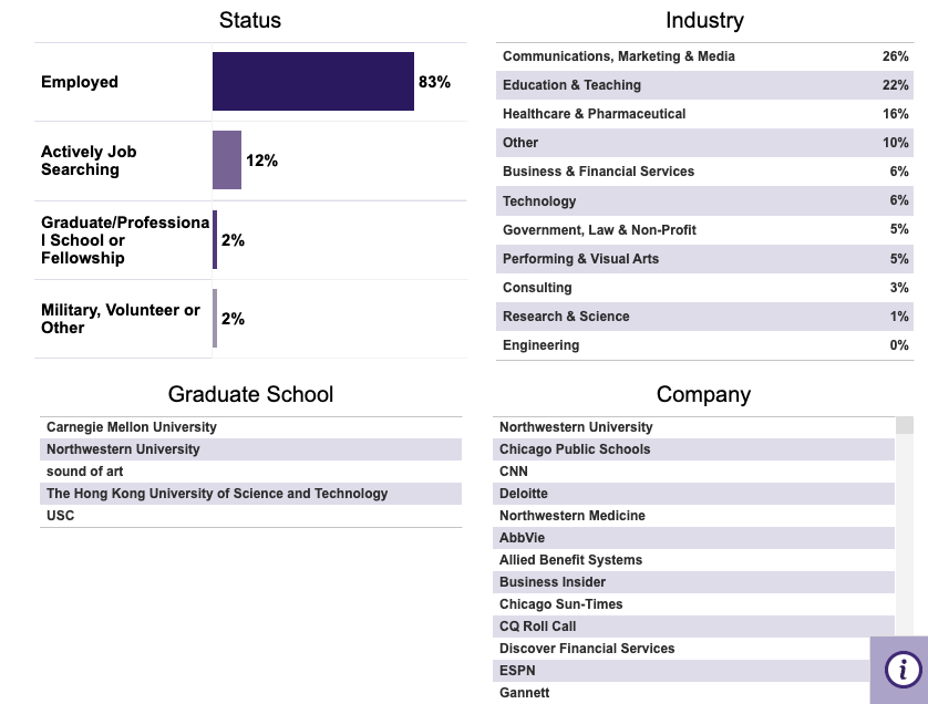 毕业生一般有以下几类的就业机会:广告/公关/营销/创意/数字媒体公司:具体的职位有客户经理(Account Management), 文案写作(Copy Writing), 视觉、平面设计、媒体策划、采购、 数字战略(Digital Strategy), 消费者调研等, 这类工作就是传说中乙方。公司或非盈利组织的营销/品牌/公关/研发部门:这里基本每个行业都有传播和营销的需要,所以行业涉及范围十分广泛。具体的工作内容涉及传播(Communication)、品牌(Branding)、公关(PR)、营销(Marketing)、筹款(Fundraising)、消费者研究(Consumer Research)、用户体验(User Experience,UX)等等,也就是传说中的甲方。科技公司:(比如Microsoft, Meta, Google, Apple, Amazon 等)除了传播和营销相关职位,这些公司通常有广告和用户体验等职位,向传媒专业学生开放。媒体公司:比如新闻机构、电视台、网络媒体、出版商、游戏公司等等。具体职位和专业相关。政府机构:在政府组织里,比如市、州和联邦机构中担任传播和公关工作。不过这类型的工作通常不对中国留学生打开大门。