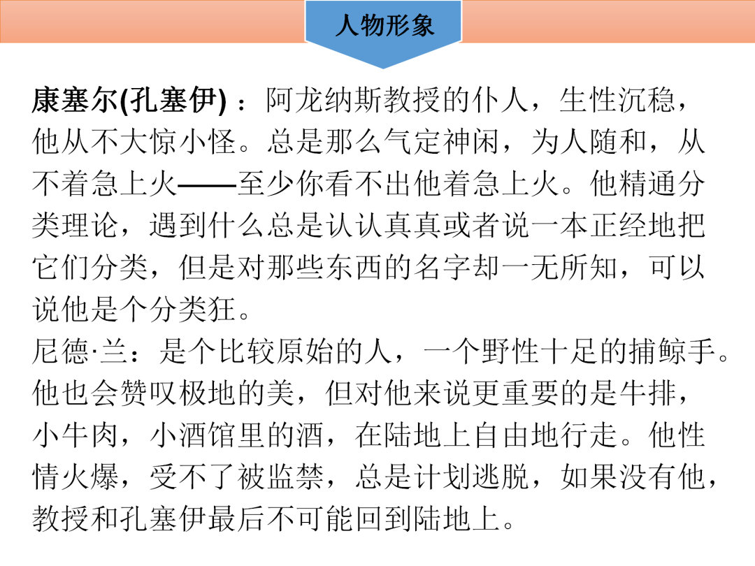 ,时长17:53【创作背景】波兰人民反对沙皇独裁统治的起义遭到残酷镇压是凡尔纳创作《海底两万里》的一个导火索。他在小说中塑造了尼摩船长这个反对沙皇专制统治的高大形象,赋予其强烈的社会责任感和人道主义精神,以此来表达对现实的批判。【内容简介】《海底两万里》是凡尔纳三部曲的第二部。这部作品叙述法国博物学家阿龙纳斯教授在海洋深处旅行的故事。故事发生在1866年,法国生物学家阿龙纳斯教授,应邀赴美参加一项科学考察活动。这时,海上发现了一只疑似为独角鲸的大怪物,阿龙纳斯教授及仆人康塞尔,受美国海军部的邀请,参加追捕活动。在追捕过程中不幸落水,泅到怪物的脊背上。其实这怪物并非什么独角鲸,而是一艘构造奇妙的潜水艇。潜艇是船长尼摩在大洋中的一座荒岛上秘密建造的,船身坚固,利用海洋发电。尼摩船长邀请阿龙纳斯作海底旅行。他们从太平洋出发,经过珊瑚岛、印度洋、红海、地中海,进入大西洋,看到许多罕见的海生动植物和水中的奇异景象,又经历了搁浅、土著人围攻、同鲨鱼搏斗、冰山封路、章鱼袭击等许多险情。最后,当潜艇到达挪威海岸时,阿龙纳斯不辞而别,把他所知道的海底秘密公布于世。如何用一句话概括《海底两万里》主要内容:主要讲述法国生物学家阿龙纳斯发现一艘潜艇,并且带着仆人康塞尔和一个捕鲸手,跟随尼摩船长乘坐这艘鹦鹉螺号潜艇在海底作了两万里的环球探险旅行的故事。【作品主题】《海底两万里》描绘的是人们在大海里的种种惊险奇遇。美妙壮观的海底世界充满了异国情调和浓厚的浪漫主义色彩,体现了人类自古以来渴望上天入地、自由翱翔的梦想。小说不但能激发人们对科学的兴趣,而且赞扬了像尼摩船长等反抗压迫的战士的形象,体现了他们具有社会正义感和崇高的人道主义精神。【艺术特色】1.构思巧妙,情节惊险。 2.科学与幻想巧妙结合。3.场面描绘与细节刻画交替出现。4.人物具有社会正义感和崇高的人道主义精神【阅读感受】1.这部小说情节曲折,描绘生动,引人入胜。2.科学与幻想巧妙结合,激发人们对科学的兴趣,更能启发人们的思考。3.人的想像力比知识更重要。【推荐理由】我喜欢《海底两万里》,因为作者描绘了人们在大海里的种种奇遇。美妙壮观的海底世界充满了异国情调和浪漫主义色彩,体现了人们自古以来渴望上天入地,自由翱翔的梦想。而且,在这本书中,我明白了我们在科学技术造福人类的同时,重视防止被坏人利用,危害人类自身的行为,还有,我们要保护海豹、鲸鱼等海洋生物,谴责滥杀滥捕的行为。关于作者凡尔纳,他被称为“现代科学幻想小说之父”。而我认为他是一个具有社会主义感和崇高的人,他笔下的人物都是品质高尚,献身科学,是英勇顽强,不畏艰险的人。就如小说中的人物尼摩船长一样,他那样反抗压迫的战士形象,正是反对殖民主义,反对奴隶制和压迫者的进步思想体现。书,读多了是有好处的。所以我向大家推荐这本我最喜爱的书《海底两万里》。相信你们读完后,都有一个美好的探险旅程。【人物形象】1.尼摩船长尼摩船长(Capitaine Nemo,又译内摩船长、内莫船长)是小说里的主人公,在书中并未说明其国籍。他的真实身份在《神秘岛》中才得以揭晓:其为印度的达卡(Dakkar)王子。尼摩是个有正义感的反抗英雄,他对民族压迫和殖民主义极端痛恨,向往民主与自由。反抗失败后的尼摩选择了归隐大海,他曾经对阿龙纳斯说“海上极度太平。海洋不属于暴君。在海面上暴君们还能行使不公平的权利,他们可以在那里战斗厮杀,把陆地上的种种恐怖都带到海面上来。但是,在海面以下三十英尺的地方,他们的权利就不起作用了,他们的影响就消失了,他们的势力消失得踪影全无”。他甚至宁愿葬身于大海深处,在安静、不受鲨鱼和人侵害的珊瑚坟墓里长眠。大海给予了尼摩以平静和心灵的抚慰,但却无法驱逐他内心深沉的孤独感,只有在管风琴编织的梦幻中,他才能得到片刻的陶醉和安宁。因此,长期与世隔绝的生活使尼摩变得冷漠、残酷、不近人情,他反对奴隶制,向往自由,却还要将他的暴力强加于人,他时不时把阿龙纳斯一行囚禁起来,强迫他们睡觉,并且强制他们永远留在鹦鹉螺号上。对殖民者的痛恨使尼摩由一种愤世嫉俗的情绪转变成了时间也无法磨灭的深仇大恨,这种扭曲了的畸形的仇恨促使他展开了疯狂的海上复仇计划。他领导船员击沉了一艘又一艘战舰;他亲手制造了一场大屠杀,并且亲眼看着爆炸的战舰和上面的受难者一点一点地沉到海底。他已经从一个令人望而生畏的伸张正义的人变成了一个不折不扣的残酷的复仇者。然而另一方面,尼摩又是一个有博爱之心的勇士,有着为人类献身的崇高精神。他请求阿龙纳斯教授为伤势严重的部下治疗,面对水手的死尼摩甚至情绪激动地留下了眼泪,并且为他举行了庄严隆重的珊瑚王国的葬礼;看到印度采珠人被鲨鱼袭击,他“奋不顾身地站了起来,拿着匕首直朝大鲨鱼冲去,和鲨鱼进行肉搏”,还慷慨地送给采珠人一袋珍珠维持生计。虽然脱离了世俗社会的生活,尼摩仍然以慈爱之心关注着被压迫国家的人民。他定期地将装有金银财宝的箱子交给固定的联系人,为殖民地人民的反抗斗争提供物质援助。不管迫使他到海底寻求自由的原因是什么,他首先是一个人,他仍然为人类