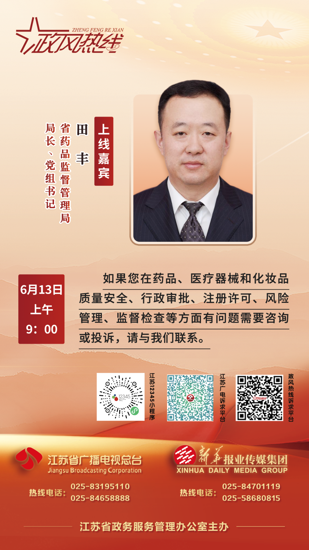 6月13日上午9:00,省药品监督管理局局长、党组书记田丰将带领相关方面负责人走进政风热线直播间,在线回应群众关切。