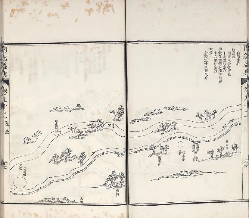 其中有三部分附有图版:卷八十五至卷八十八为阅武,记载皇帝出巡时的官兵接驾事宜、视察兵营阵地、检阅战阵演练等;卷八十九至卷九十三为程涂,记载巡视途经地区的风土人情;卷九十四至卷一百零五为名胜。今存卷九十二·程涂·二十七叶版画雕版,因系进呈本缘故,此书雕版应在地方刊刻完成后再运回宫中,相比《皇朝礼器图式》雕版,其版面的细节修饰和线条的流畅程度均不如内府雕造的书版精致。