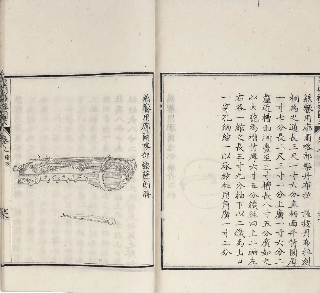 每件器物的详细尺寸、质地、纹样以及与相应官职品级的对照,条理清晰,记载详备,对了解和研究清代宫廷礼仪和典章制度具有重要意义。现存卷九·乐器·七十八叶雕版一块,左侧为“燕飨用郭尔喀部乐萨郎济”乐器图,线条繁密有致,精美异常,有玲珑剔透之感;同时,雕版的挖版处及四周边角也经过了细致的打磨,使整块雕版手感厚重且圆润,将清代内府高超、细致的刊刻技艺展露无遗。