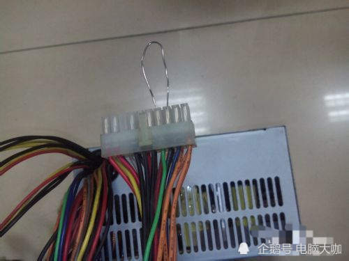 然后在20针(这里以20针为例)的针脚中找到一条绿色线以及随意一条黑色线的针脚,接通电源线,接着用铁线将黑色线的针脚跟绿色线的针脚连在一起,电源的风扇转动,证明电源是好的,如果电源风扇不转动,证明电源坏了。