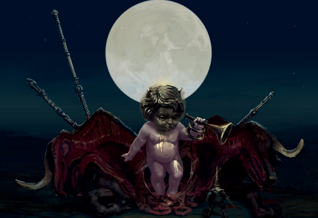 这里插一句,游戏中月光之子的创作灵感来自于神话中,神子于苦难降临的情景,游戏中表现为:月下插满花镖的黑牛被一分为二,神子在其尸体中诞生。