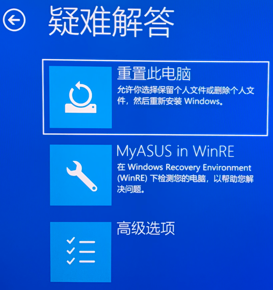 按下电源按钮后,快速按F12键(或F9键)几次以进入【选择一个选项】界面。依次点击【疑难解答】【MyASUS in WinRE】。