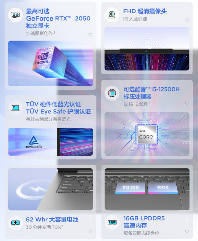 全新的Intel第12代酷睿处理器较以往性能提升巨大,一般用户建议选购12代i5版本即可,足以满足大多数场景下的需求,并且散热压力也比较小,当然如果对CPU性能要求较高,也可以选择i7版本,RTX2050 4GB独立显卡(50W)应对网游和一般单机游戏,压力还是不大的。