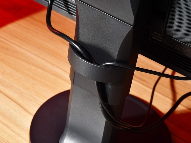 EIZO CG2700X由于体积大、重量大,如果移动显示器的时候直接使用背部靠上位置的提手。通过提手来提起显示器比较省力,而且单手就可以完成。在显示器支架上,还设计了束线器,这样在使用多线缆的时候,也可以将它们束缚在一起,避免出现过于凌乱的情况。