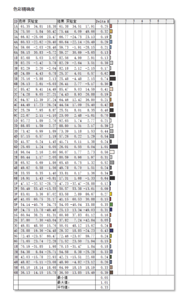 在显示领域中,我们用ΔE的数值来表达色彩还原准确性。ΔE的数值是显示器实际色彩还原与标准值之间的差距,数值越小越好。在实际测试中,EIZO CG2700X显示器的最大ΔE值为1.01,平均ΔE数值为0.33。