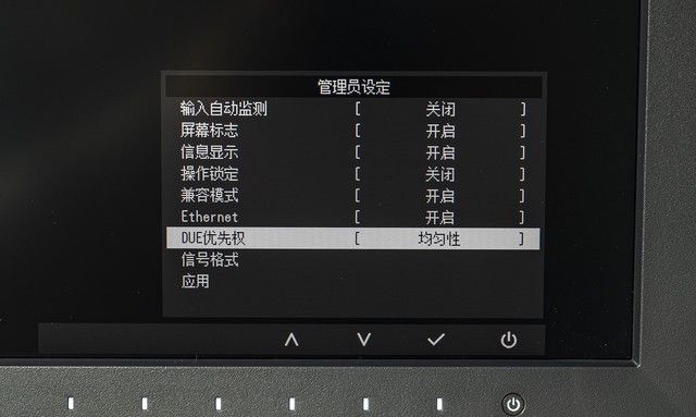 EIZO CG2700X包含数字均匀均衡器(DUE)功能,以减少屏幕显示的差异。用户可以通过“管理员设定”菜单中进行“DUE优先权”的设定。平时默认是亮度,强调高亮度和高对比度;如果用户需要屏幕均匀性拥有更好的表现,将选项更改为均匀性即可,可以强调减少显示差异。