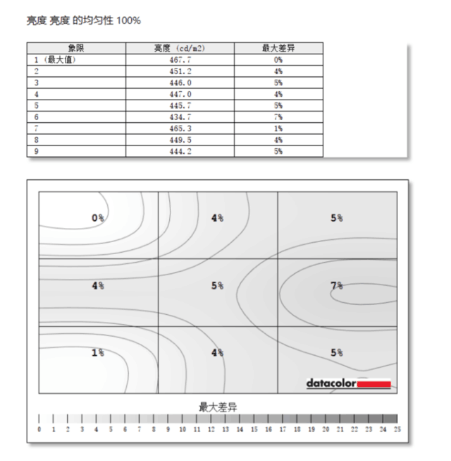 在测试过程中,我们将显示器等分为9个区域,分别测试9个区域的实际亮度值,与标准测试亮度值(120cd/m2)进行对比。通过测试,我们可以看到EIZO CG2700X的均匀性最大偏差值为7%,这个表现完全达到一款专业级显示器该有的水准。