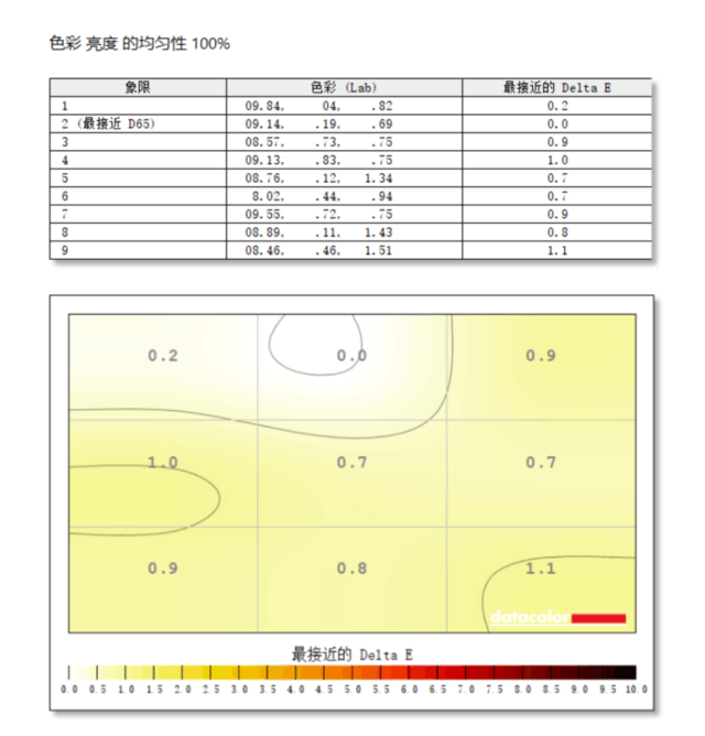 EIZO CG2700X的色度均匀性测试中,我们依然将“DUE优先权”设定为均匀性。测试过程与亮度均匀性一样,将显示器平分为9个区域,分别测试9个区域的实际色温,然后与D65标准色温去比较,计算出偏差值,也是用ΔE值来表示。