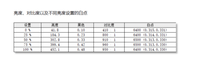 用户在日常使用的时候,会在不同情况下调节不同的亮度值显示。色温一致性考验的就是不同亮度下,白点色温的稳定性,因为用户即使调节亮度,显示器带来的色温、对比度变化也不应该有较大的偏差。在测试过程中,我们将EIZO CG2700X的亮度调节到0%、25%、50%、75%和100%,测试全白画面亮度和全黑画面亮度以及色度坐标,计算出实际的对比度以及色温值。