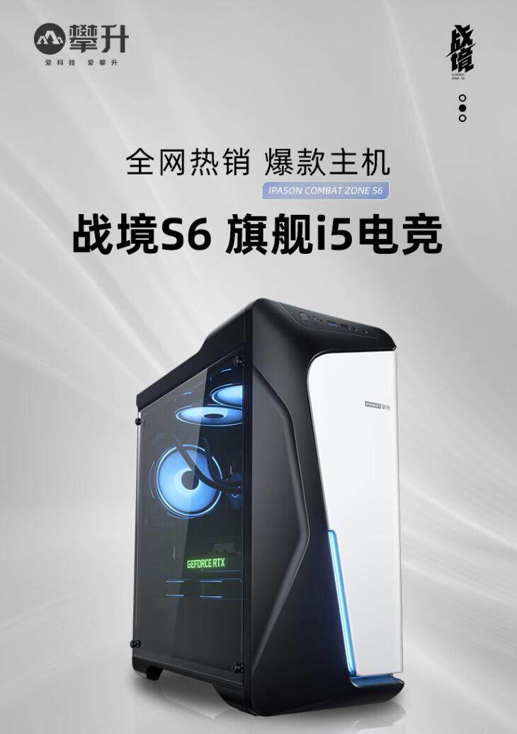 在本次活动中,攀升带来了旗下更受欢迎的战境S6主机。战境S6作为攀升旗下最受消费者青睐的战境系列在2022年推出的新版本,采用了全新的黑白撞色设计,机箱正面用拼接风搭配蓝色灯带,搭配当下流行的大侧透设计,整机的颜值相当在线。在硬件上,攀升也是同样的诚意十足,i5 12490F处理器、RTX 3060显卡、B660M主板、8G*2的DDR4 3200MHz内存、512G NVMe M.2固态硬盘、650W的80Plus认证电源。