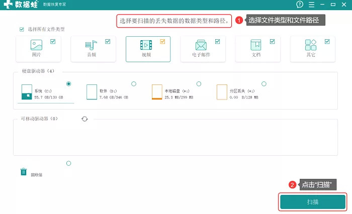 1.在官方网站上下载好软件,之后打开界面,选择你要恢复的文件类型(可以直接单选文档,也可以选择全部勾选)和文件所在的位置,直接选择“扫描”。