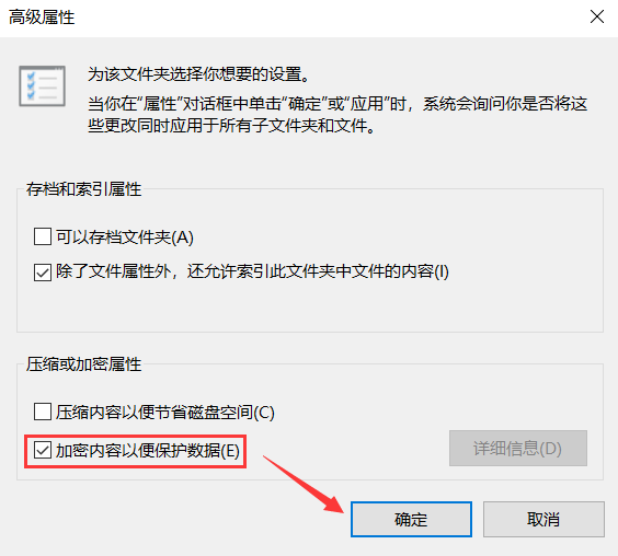 3.之后就会继续弹出一个窗口,在压缩或加密属性下,选择“加密内容以便保护数据”即可。