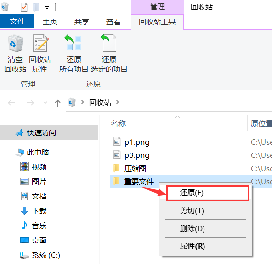 我们删除的文件一般都会经过回收站,所以你只需要打开电脑“回收站”,在里面找到你要恢复的文件,选中它,右键点击“还原”就可以恢复在电脑桌面上了。