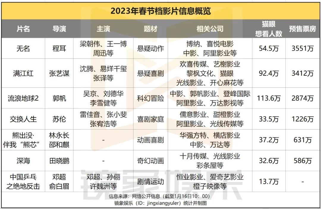 截至目前,2023年春节档已定档影片共7部。重回春节档的《流浪地球2》手握吴京+刘德华的强势阵容,张艺谋新片《满江红》则由沈腾、张译、易烊千玺等主演,梁朝伟搭档王一博的《无名》暂时在预售票房榜拔得头筹,《交换人生》的喜剧底色、《深海》的“前作滤镜”也让两部影片颇具黑马相,《中国乒乓之绝地反击》题材差异化明显,《熊出没·伴我“熊芯”》继续稳定在亲子市场……一时间,春节档又显现出“神仙打架”的态势。