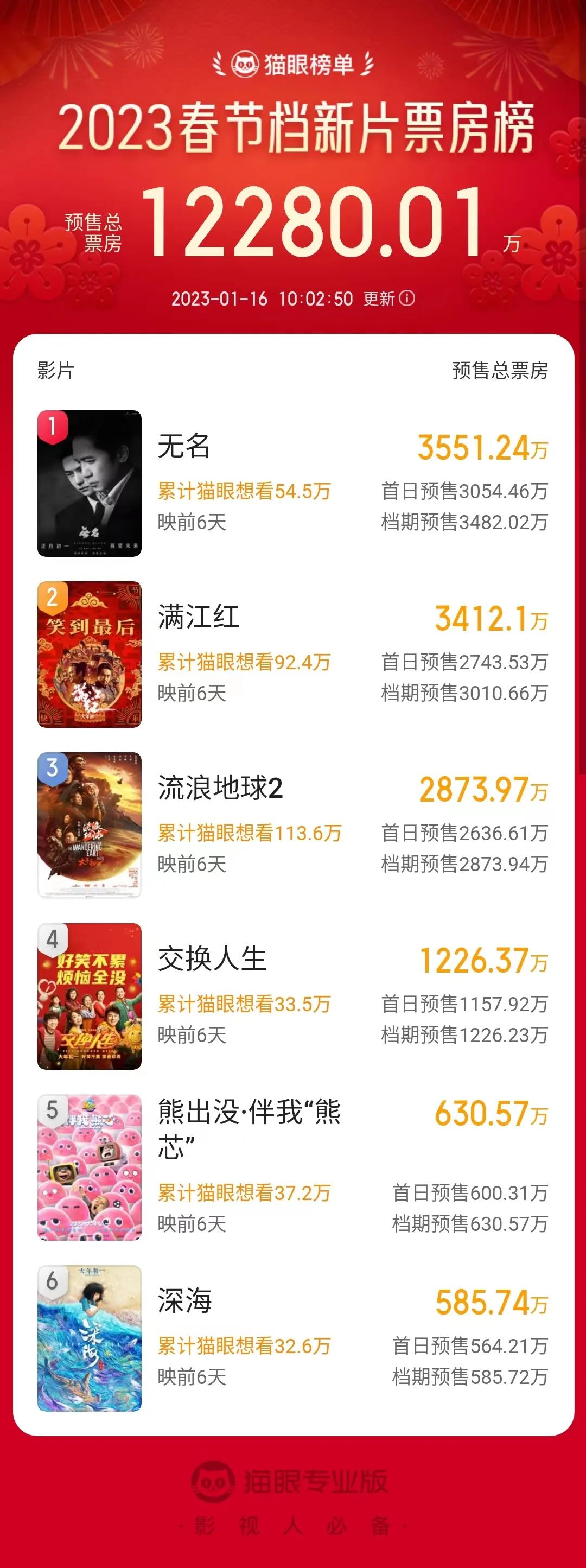 猫眼数据显示,截至1月16日上午10点,《无名》预售票房率先突破3500万,暂列春节档预售票房榜首位,《满江红》《流浪地球2》紧随其后,分别位列第二位和第三位。