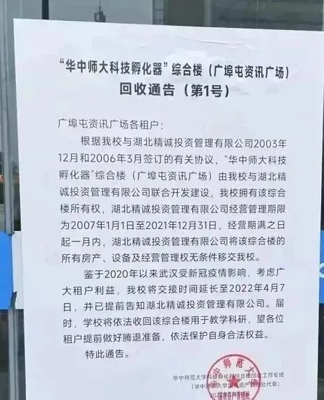 此前,华中师范大学发布了一则“华中师大科技孵化器”综合楼(广埠屯资讯广场)回收通告,由于武汉广埠屯资讯广场合同到期,将被华师收回做教学科研楼。
