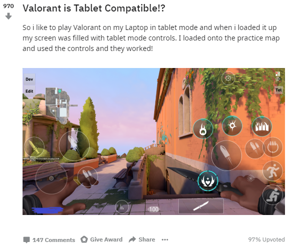 在4月12日,有一个外国玩家在reddit上发帖,表示他发现了瓦洛兰特的新打开方式。这位玩家尝试在笔记本电脑上,以平板电脑的模式玩瓦洛兰特,而他获得了全新的游戏体验。瓦洛兰特似乎变成了一款为平板电脑设计的射击游戏,每个实战操纵的选项,都具有了触摸屏的图标和按钮,包括技能使用、主射击、副射击、跑步、蹲下、填弹等。