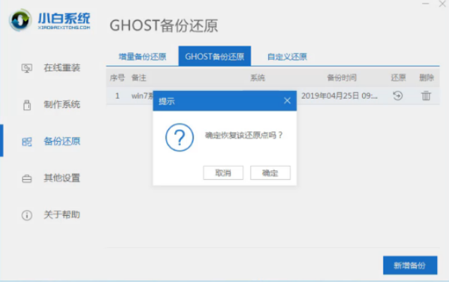 1.系统映像备份完成后,一键重启小白重新安装系统,将界面切换为“备份还原”,选择“幽灵备份还原”,我们将看到新备份的win7系统映像文件,单击“还原”“按钮。