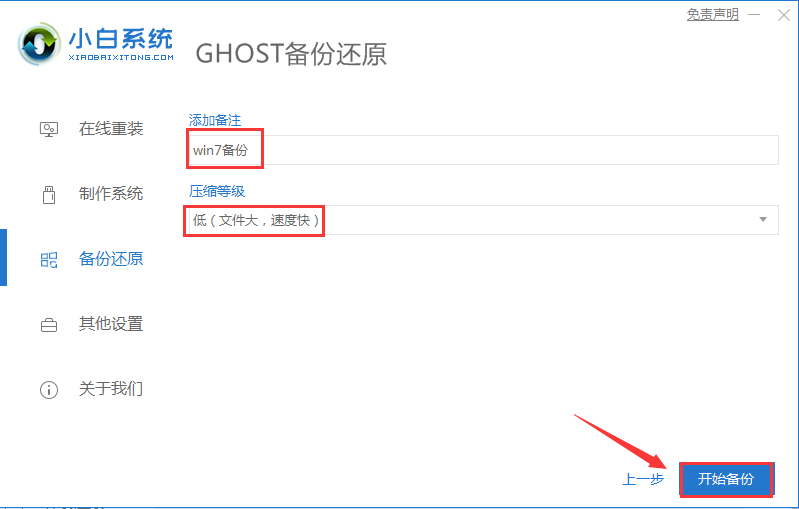 4.出现如下图所示的界面。我们将“添加注释”到需要备份的系统映像,并将压缩级别更改为“低(大文件,快速)”选项,然后单击“开始备份”。