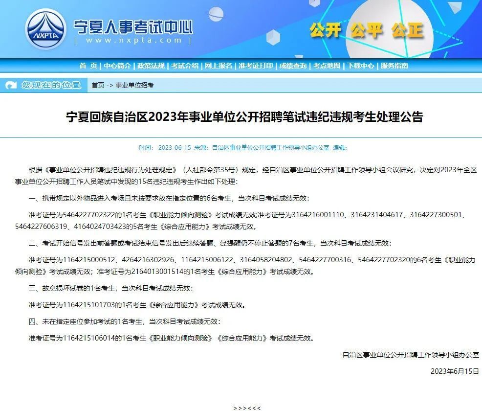 6月15日,宁夏人事考试中心发布公告,根据《事业单位公开招聘违纪违规行为处理规定》(人社部令第35号)规定,经自治区事业单位公开招聘工作领导小组会议研究,决定对2023年全区事业单位公开招聘工作人员笔试中发现的15名违纪违规考生作出处理。