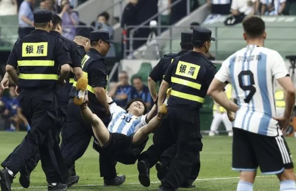 值得一提的是,友谊赛进行时出现一个“小插曲”。根据球迷现场拍摄的视频,一名身着阿根廷球衣的男性球迷,趁着场边安保人员不注意,先是从看台跳到球场边,随后又绕过安保人员的包围圈,径直冲进球场。他先是拥抱了梅西,随后又向球场另一端跑去,还与阿根廷门将马丁内斯击了个掌。