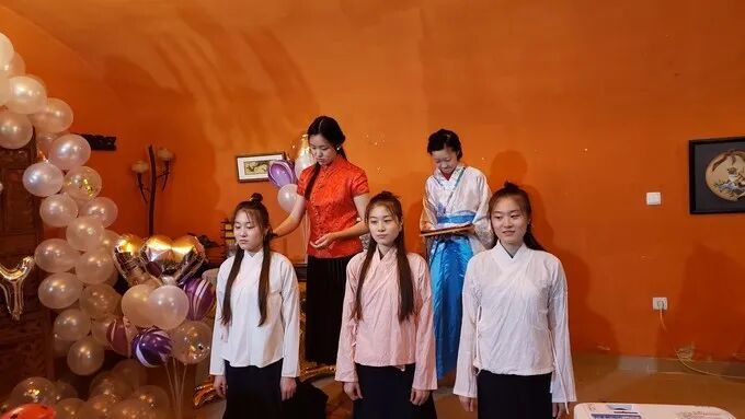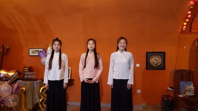 笄者就位,笄礼开始,有请将笄者佟年、佟月、佟天出东房,笄者向众宾客行拜礼。