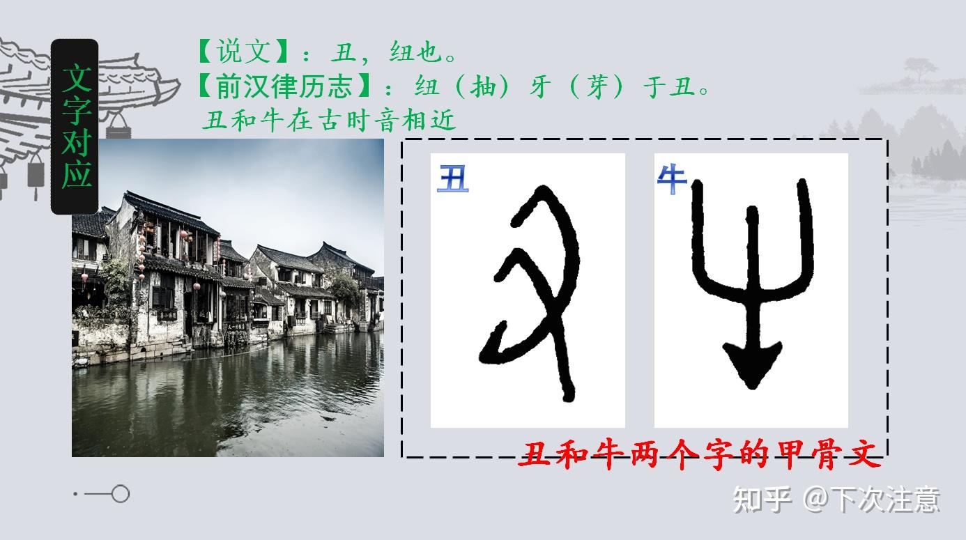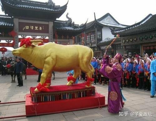 《礼记·月令》云:“(季冬之月),命有司,大难旁磔,出土牛,以送寒气。”意思是在季冬之月,官方会举行送寒气的活动和仪式,在城邑的四方之门,披磔其性,宰牲禳祭,还要用土为主要材料塑造牛的形象,然后送出城门,并举行鞭春牛的活动,以激发阳气,促其奋发。“出土牛”是季冬之月官方的重大活动,也成为浓厚的民间习俗,加上牛是勤劳的象征,未春先奋,未明先起,故把牛和丑时对应了起来。