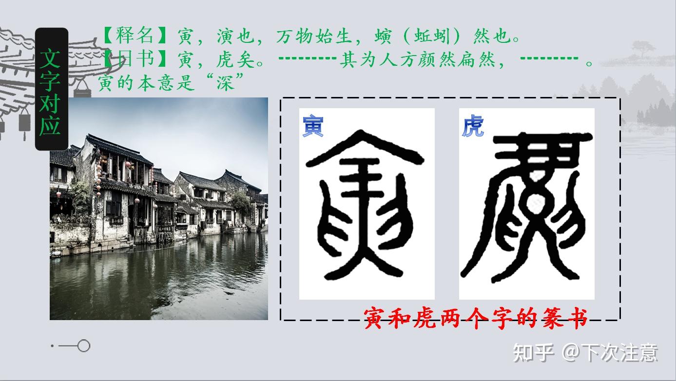 寅时代表一年当中的孟春之月,节气为立春和雨水。古代夏历以建寅之月为岁首,立春日就是新的一年的开始。年终岁首要杀猪过节,十二生肖系统不以猪对应寅时,可见十二生肖并非起源于夏代。孟春之月,五行属木,其性生发,虽然还不到“蛰虫咸动,启户始出”的时候,但万物已是生机勃勃的状态,地中的草木蛰虫状如伏虎,早已鼓足了劲而呼之欲出。虎之为猎,伏而静处,等待时机,时机一到,猛然跃出,雄霸之气,不可敌也。孟春之月,生机盎然,元阳之气蓄势待发,草木蛰虫,状如伏虎,其势欲突,故把虎与寅时对应了起来。