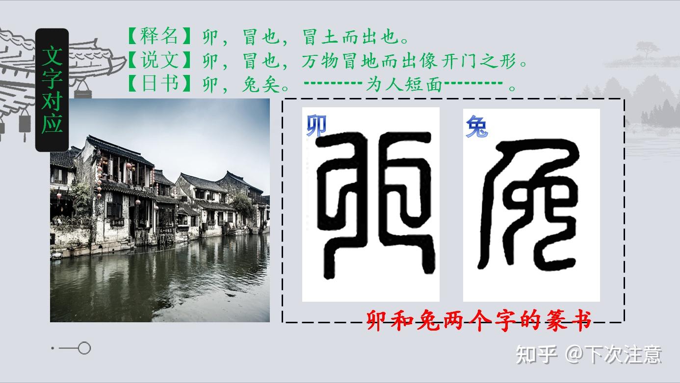 卯时对应一年当中的仲春之月,节气为惊蛰和春分。《礼记·月令》云:“是月(仲春之月)也,日夜分,雷乃发声,始电,蛰虫咸动,启户始出。”仲春之月,万物始出,小草也偷偷地从土里钻了出来,田野变得绿了起来,这可馋坏了吃了一冬天干草的兔子,早早就出来尝鲜了。草很底,兔子无处遁形,所以我们在这时候常见到兔子,故把兔和卯时对应了起来。