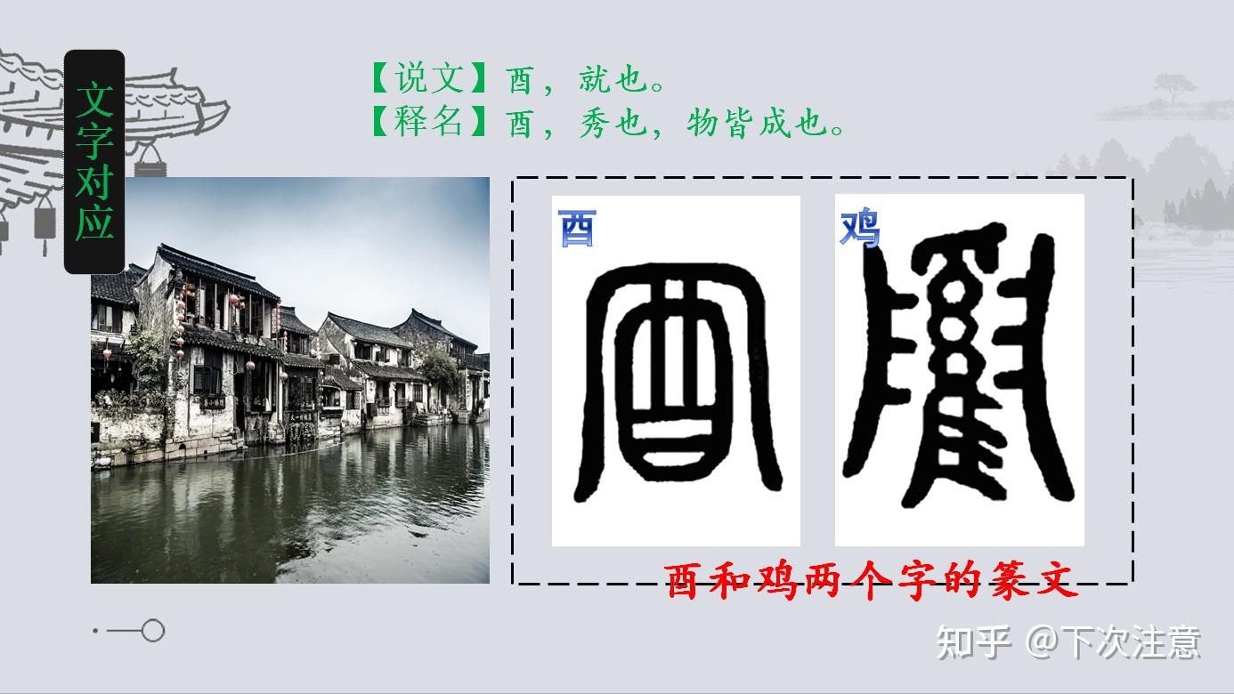 酉时代表一年当中的仲秋之月,节气为白露和秋分。仲秋是收获的季节,打谷场上,到处是粮堆,地上也到处是遗落的粮粒。收获的季节也是家鸡最快活的时候,打谷场上,常见三五成群的家鸡在游荡,乘看粮的主人不注意,跑上粮堆就刨,这些鸡眼馋肚饱,不是抢着吃,而是使劲刨,往往把收起来的粮堆给刨个稀烂,气得人拿着农具使劲赶这些鸡。家鸡越是在丰收的季节越是显示着这种不良的习气,给人留下了深刻的印象,因此,人们把鸡和酉时对应了起来。另外,仲秋丰收后,人们有了余粮酿酒,酉就是酒的初文,家鸡的红脸和大红冠子就象是喝醉的样子,所以人们边把鸡和酉对应了起来。