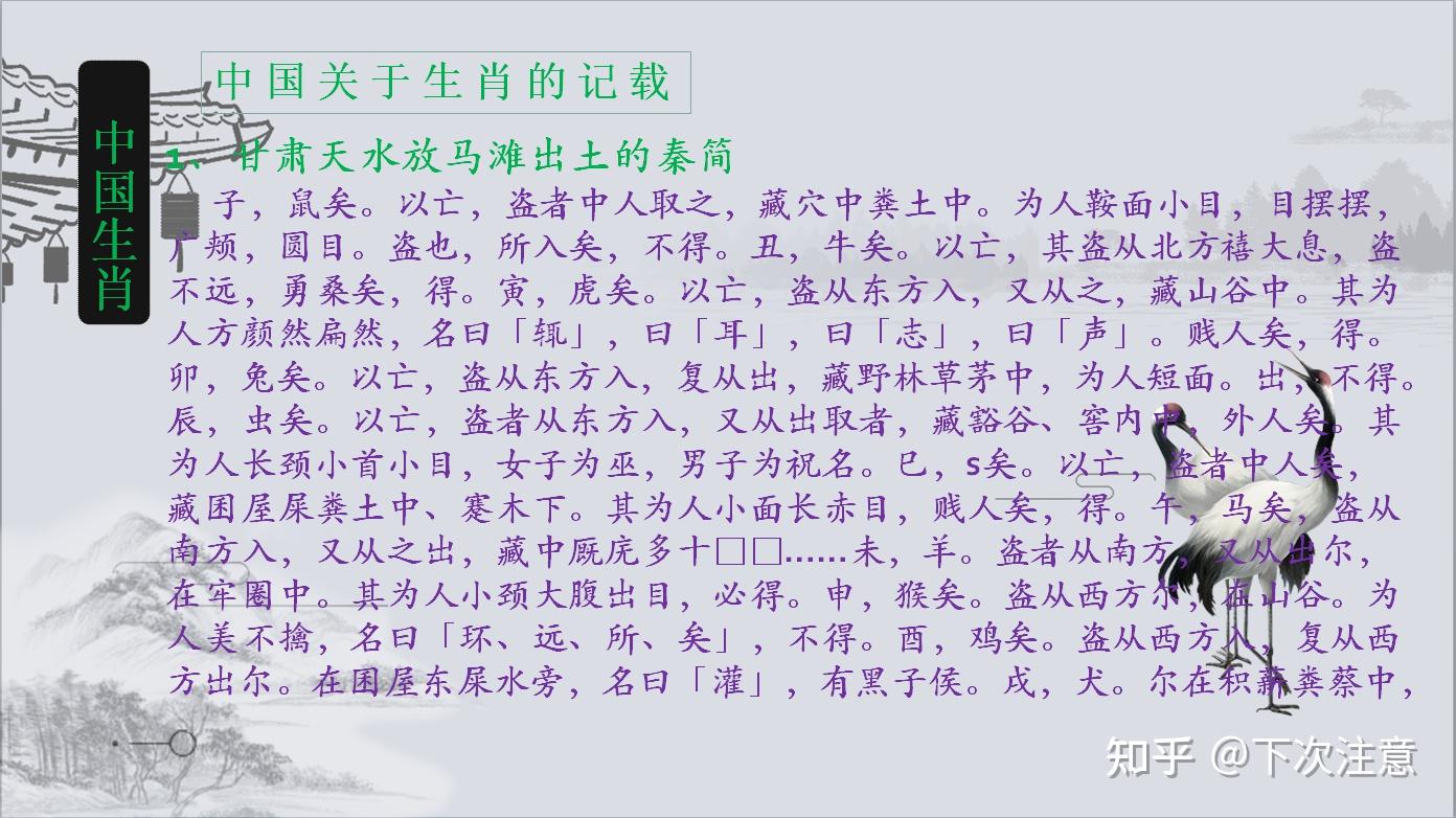 1975年,在湖北云梦县睡虎地十一号墓出土了大量的竹简,其中《日书·盗者篇》中记载:“子,鼠也,盗者兑口希须,……丑,牛也,盗者大鼻长颈,……寅,虎也,盗者状,希须 ,面有黑焉。卯,兔也,盗者大面头。辰,盗者男子,青赤色……已,虫也 ,盗者长而黑蛇目。午,鹿也,盗者长颈小哘,其身不全。……未,马也,盗者长须耳。申,环也,盗者圆面……”这些记录的内容,乃是据时推测盗者的形体容貌,并不具科学性,我们这里不讨论这方面的问题,我们只是发现这些记录与十二生肖有诸多相似之处。据考证,睡虎地十一号墓下葬于公元前217年,因此可以推断,十二生肖的雏形起码在秦代或稍早就应该产生了。《日书·盗者篇》中的记载与如今的十二生肖并不完全一致,故我们认为它是十二生肖的雏形。