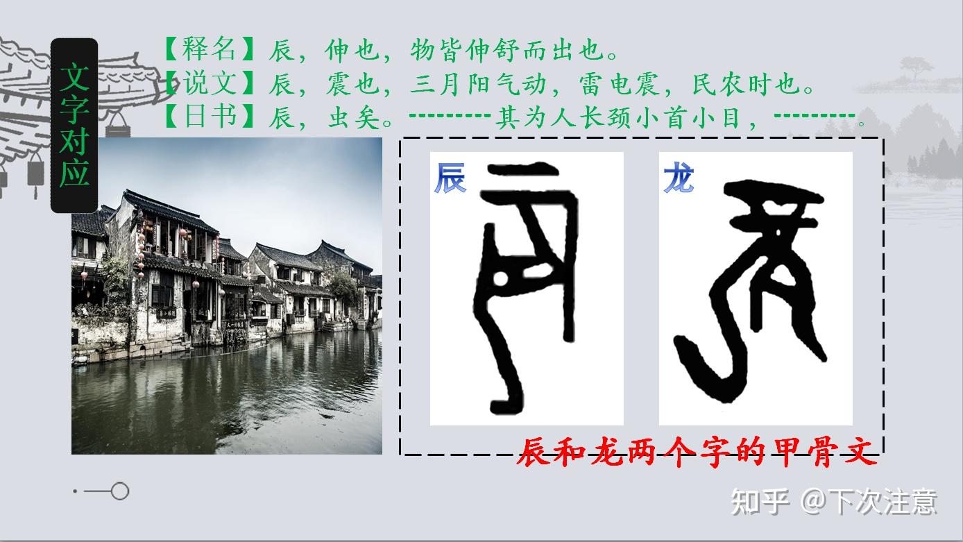 龙是我国古人创造的一种善于变化的神物,《三国演义》中曹操煮酒论英雄时这样描述龙,他说:“龙能大能小,能升能隐;大则兴云吐雾,小则隐介藏形;升则飞腾于宇宙之间,隐则潜伏于波涛之内。方今春深,龙乘时变化,犹人得志而纵横四海。龙之为物,可比世之英雄。”这里的“春深”就是指季春之月。《易》以“震为龙”,季春之月,万物变化剧烈,如龙纵横天地,行云吐雾,乘时变化,故以龙对应辰时。辰,震也,雷行天上,雷大震也。