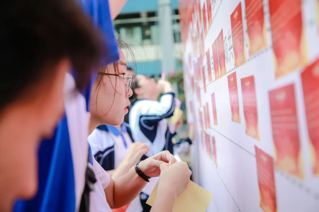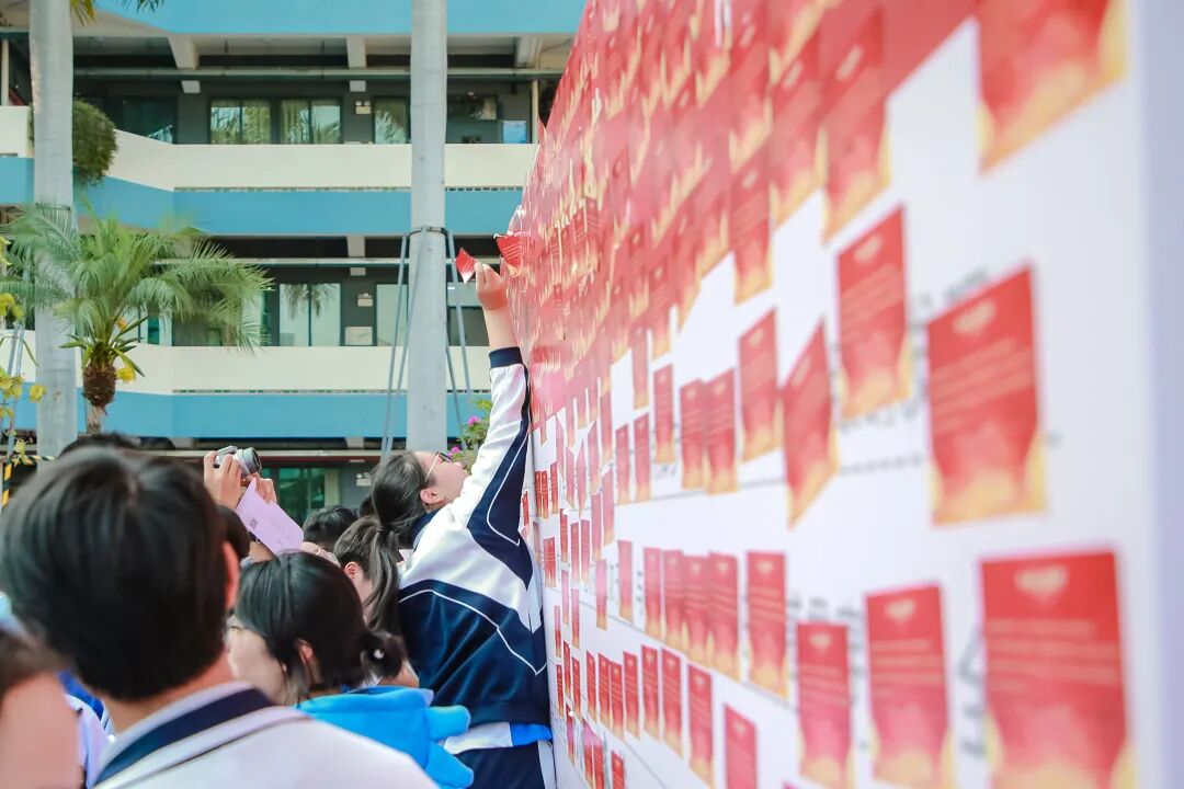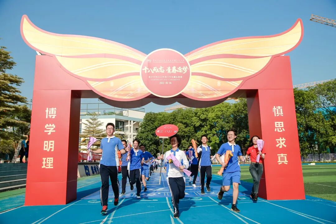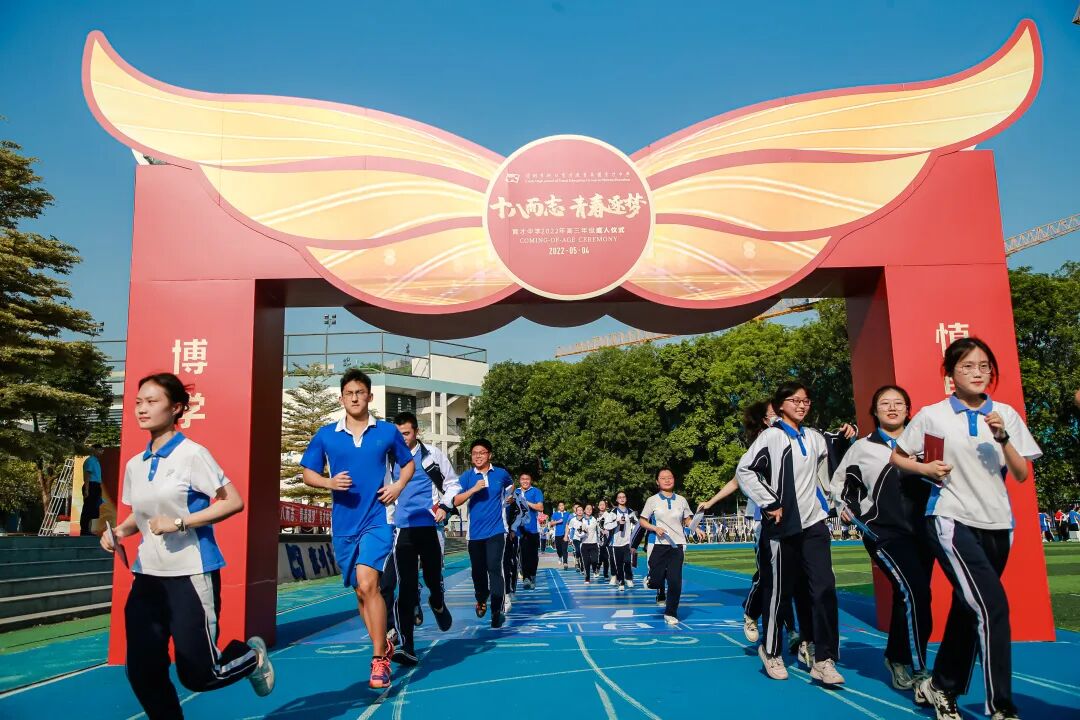 成人礼的最后一项,是最激动人心的跃门仪式。同学们伴随着每个班主任老师的深情寄语,漫步走过育才时光跑道,回顾青春岁月中的点点滴滴;冲刺迈过成人门,勇敢迎接高考的挑战。最后在大大的梦想展板上张贴上属于自己的独一无二的梦想卡片,为整个成人礼画下了完美的句点。