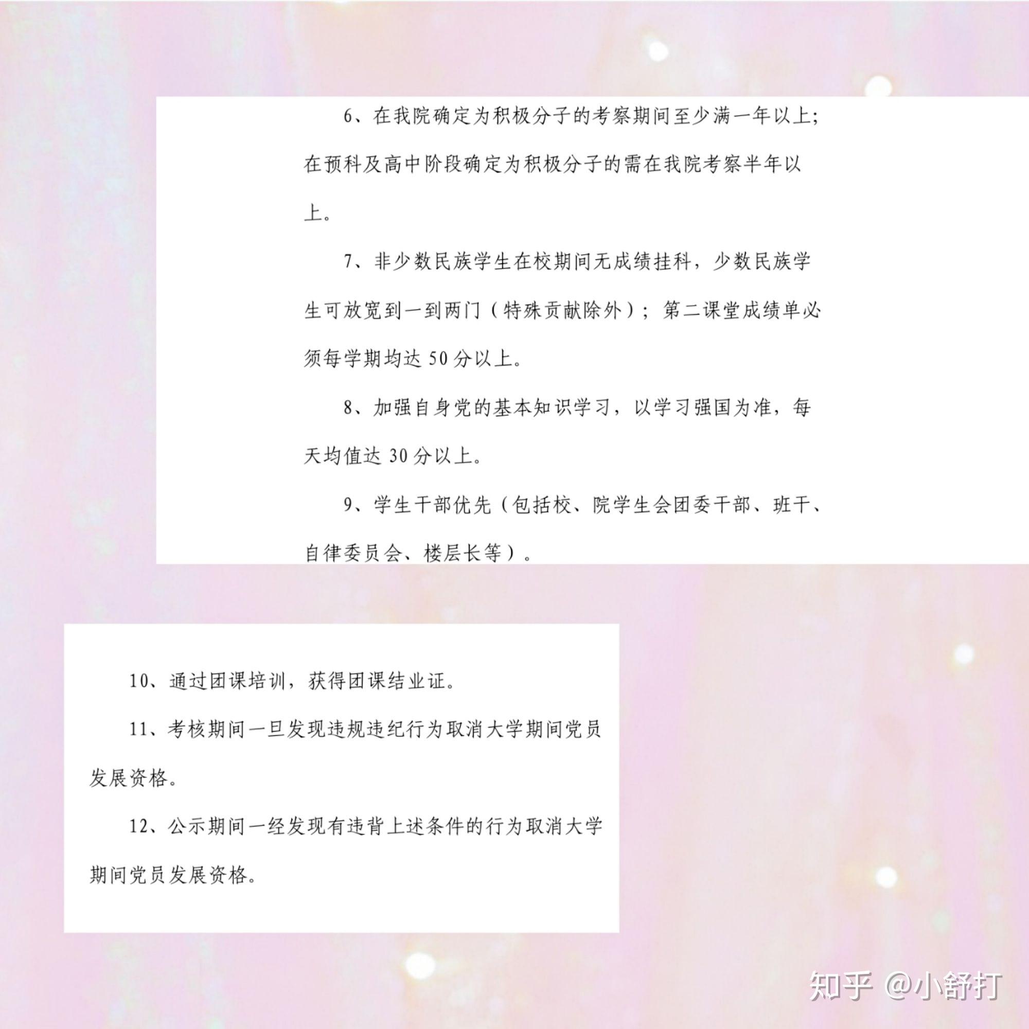 3、学习工作态度端正,遵守校规校纪,拥护民族团结,维护学校安全稳定,综合素质测评排名前50%以上且没有单科成绩挂科。对于有突出贡献或在民族学生中起到积极引导作用的少数民族学生,单科成绩挂科不超过两门。校规校纪就不用说了吧,不管你入不入党,都应该遵守。关键的在后面,每一学年都会有综测排名,50%很简单。挂科这个事儿更简单,你挂了,就别想有机会了。