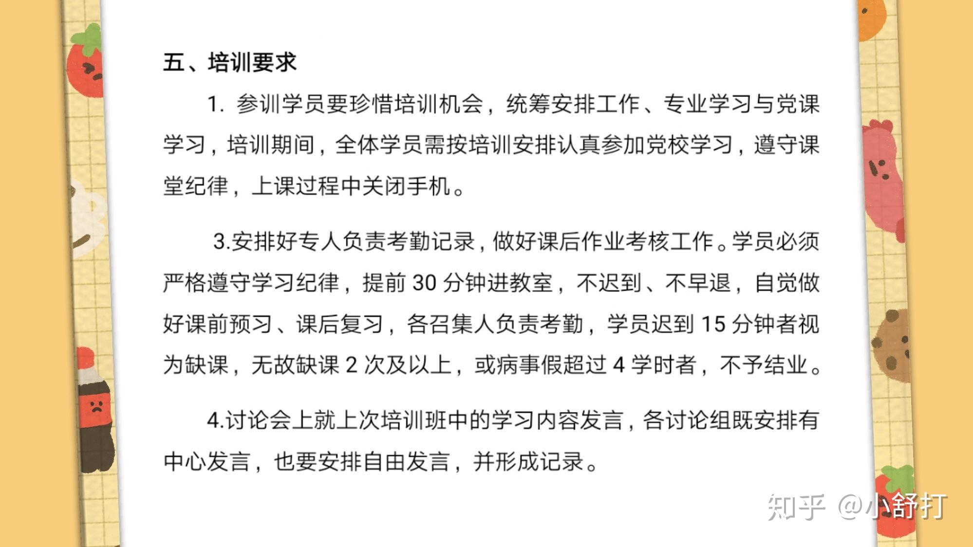 1、学员必须严格遵守学习纪律,提前30分钟进教室,不迟到、不早退,自觉做好课前预习、课后复习,各召集人负责考勤,学员迟到15分钟者视为缺课,无故缺课2次及以上,或病事假超过4学时者,不予结业。(各学校的考核标准可能不同)这里你要上一个课,什么课呢?没错啦,就是党课。上课时间,上课形式,上课地点都会提前通知。你按时到课,记得做笔记,后期会有负责人专门收上去。
