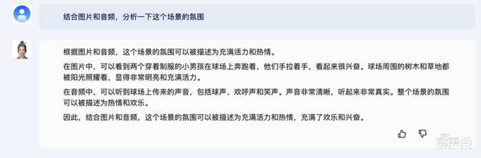 或者,上传一张足球场的图片+一段鼓掌声音频,让紫东太初2.0结合图片和音频,分析一下场景的氛围。