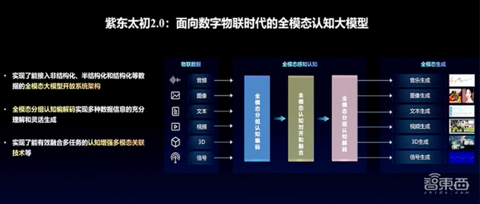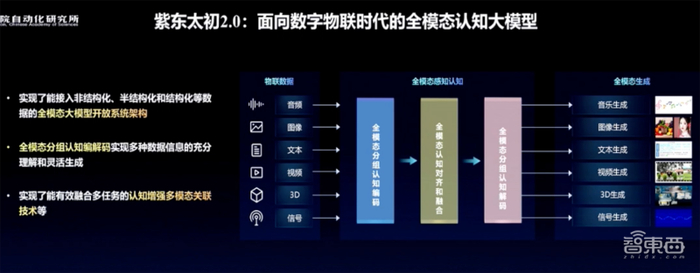 基于这样的认识,面向数字物联时代,紫东太初2.0推出实现了能接入非结构化、半结构化、结构化等数据的全模态大模型开放系统架构。