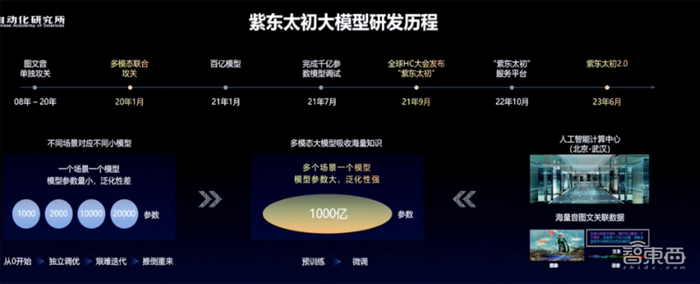徐波说,中科院早在2008年就开始推进图文音的单独攻关,2020年1月启动多模态联合攻关,从2021年1月做出百亿模型到2021年9月发布全球首个千亿参数图文音三模态大模型紫东太初1.0,再到推出紫东太初2.0,以昇腾AI硬件及昇思MindSpore AI框架为基础,依托武汉人工智能计算中心算力支持,利用预训练+微调技术,在大的神经网络上,把多个场景的知识和数据都吸纳到一个模型上。