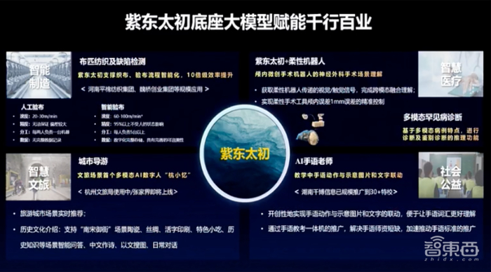 徐波说,紫东太初底座大模型正赋能千行百业,包括布匹纺织及缺陷检测、文旅导游、柔性手术机器人、AI手语老师等。