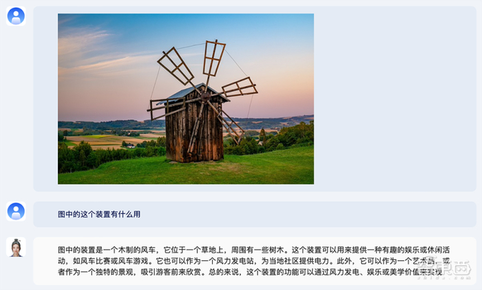 上传风车的图片,问“这个装置的作用是什么”,紫东太初2.0给的回答包括“风力发电站”。