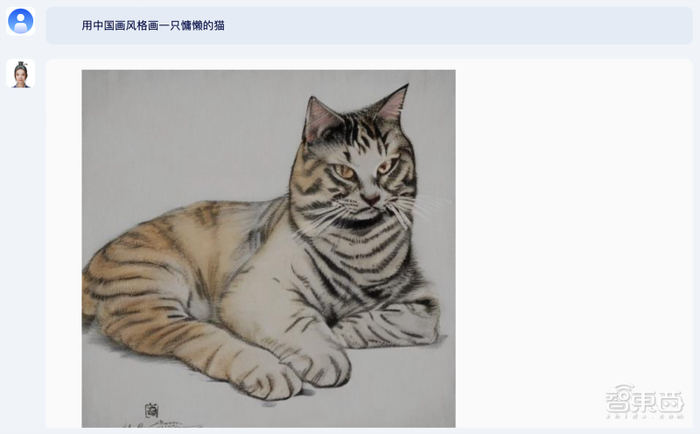 在生成图像方面,紫东太初2.0可以生成指定风格的图。比如我要求“用中国画风格画一只慵懒的猫”,紫东太初2.0立刻画出了一张卧着的虎皮猫。