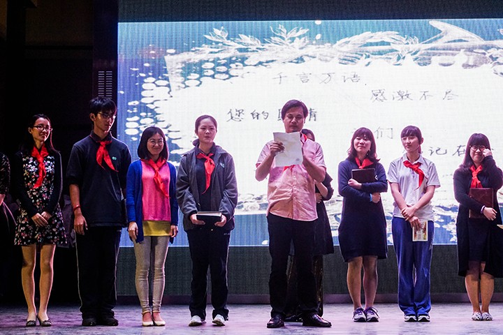 十四年的成长离不开父母的辛勤哺育以及师长的辛勤教诲。我们通过视频倾听了爸爸妈妈对我们的心里话,理解了他们无私的爱。最让人感动的是接下来的“感恩师恩”环节,每位班主任和班长齐聚舞台,当班长向班主任致完感恩词并献上相册,台下的同学就不约而同地站起来,异口同声喊出“老师,我们爱你!”这声音长久地回荡在夜空中,短短几个字,却浓缩了桃源少年们对老师无限的感激与挚爱,令大家难以忘怀。